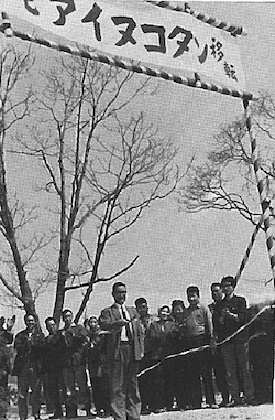 1963(昭和38)年よりポロト湖畔で公園造成が始まり、1965(昭和40)年、アイヌコタンが移転して「ポロトコタン」がオープンした。運営にあたる「白老観光コンサルタント株式会社」には、野村義一、山丸武雄という白老アイヌのリーダーが専務理事として経営陣に加わった。野村義一はアイヌ民族として初めて国連総会で演説を行った伝説の人物である。
